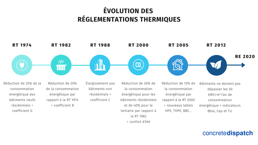 La RT2012 et la RE2020 ne sont pas les premières réglementations pour réduire la consommation énergétique des bâtiments. En effet, 5 réglementations thermiques (RT) ont été mises en place depuis 1974.